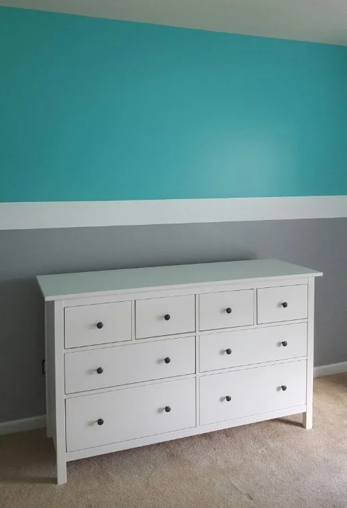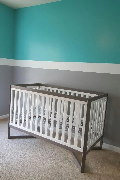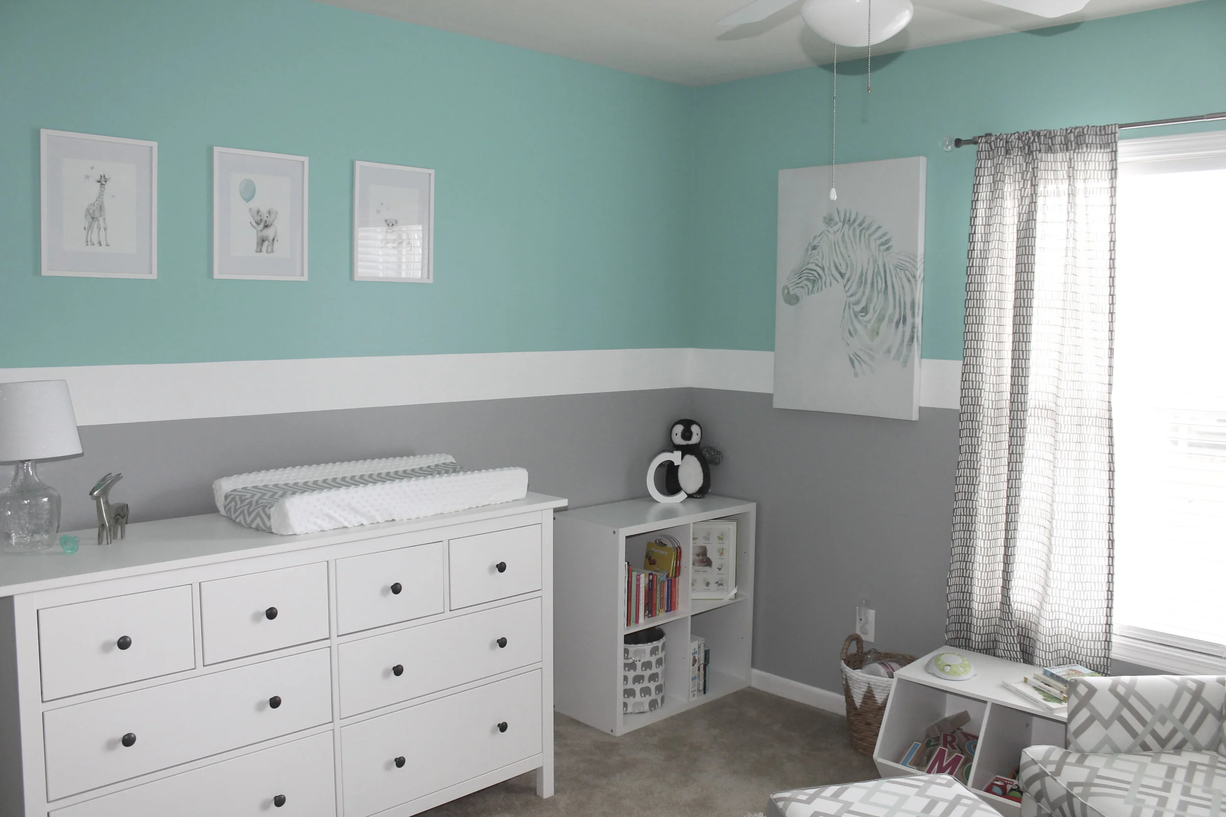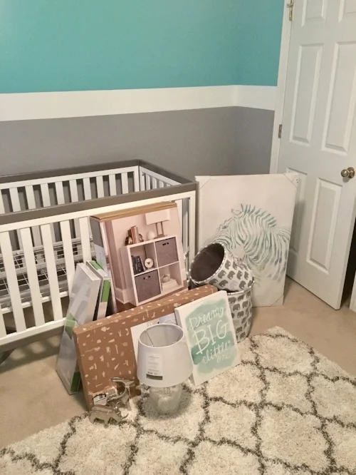 Over time, I convinced Harold and Tiffany to go with turquoise or teal as the new primary color of the room and slowly began to build their design board. As comfort and functionality were key, I split the small bedroom into three parts: Change, Play and Sleep. On the right side, we’d position a dresser for changing Baby Uno and storing away his or her wardrobe and necessities – umm, you know…baby stuff. In the middle of the room in front of the window, we’d place all of Baby Uno’s toys with a fluffy rug in the center for comfortable tummy time, crawl time and play time. Lastly, the left side of the room would be designated for Baby Uno’s soon-to-be favorite four walls: his crib.