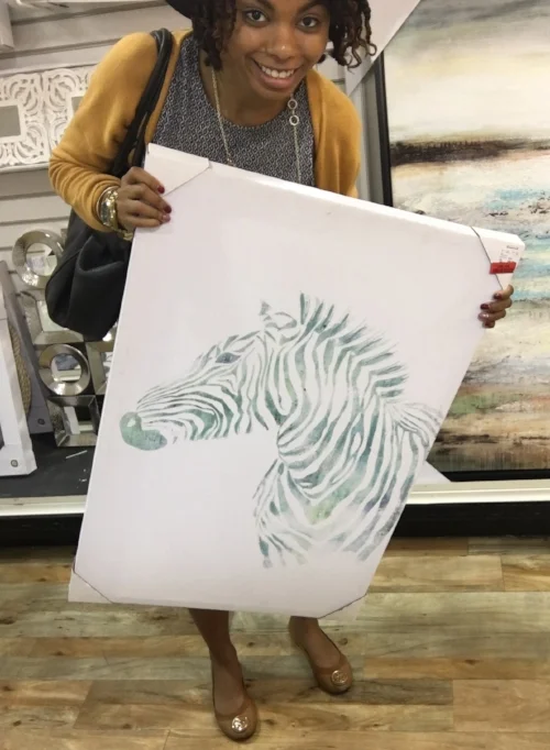 They loved the cribs I chose as options and went with a convertible crib from Joss & Main, later purchased by one of Baby Uno’s new grandparents. We selected a white dresser from IKEA and considered the possibility of updating the knobs to something more cute and custom at a later time. Floating shelves for displaying baby photos and keepsakes would go on each side of the crib wall with Baby Uno’s yet to be decided name adorned at the center above the crib. I found an awesome Zebra canvas that matched the nursery on clearance in HomeGoods in San Antonio and sent a photo of it to the parents for their approval. As Tiffany began to knock out the shopping and to-do lists I created for them, Harold hired a painter for the new striped walls and began assembling each new furniture item himself, piece by piece.
