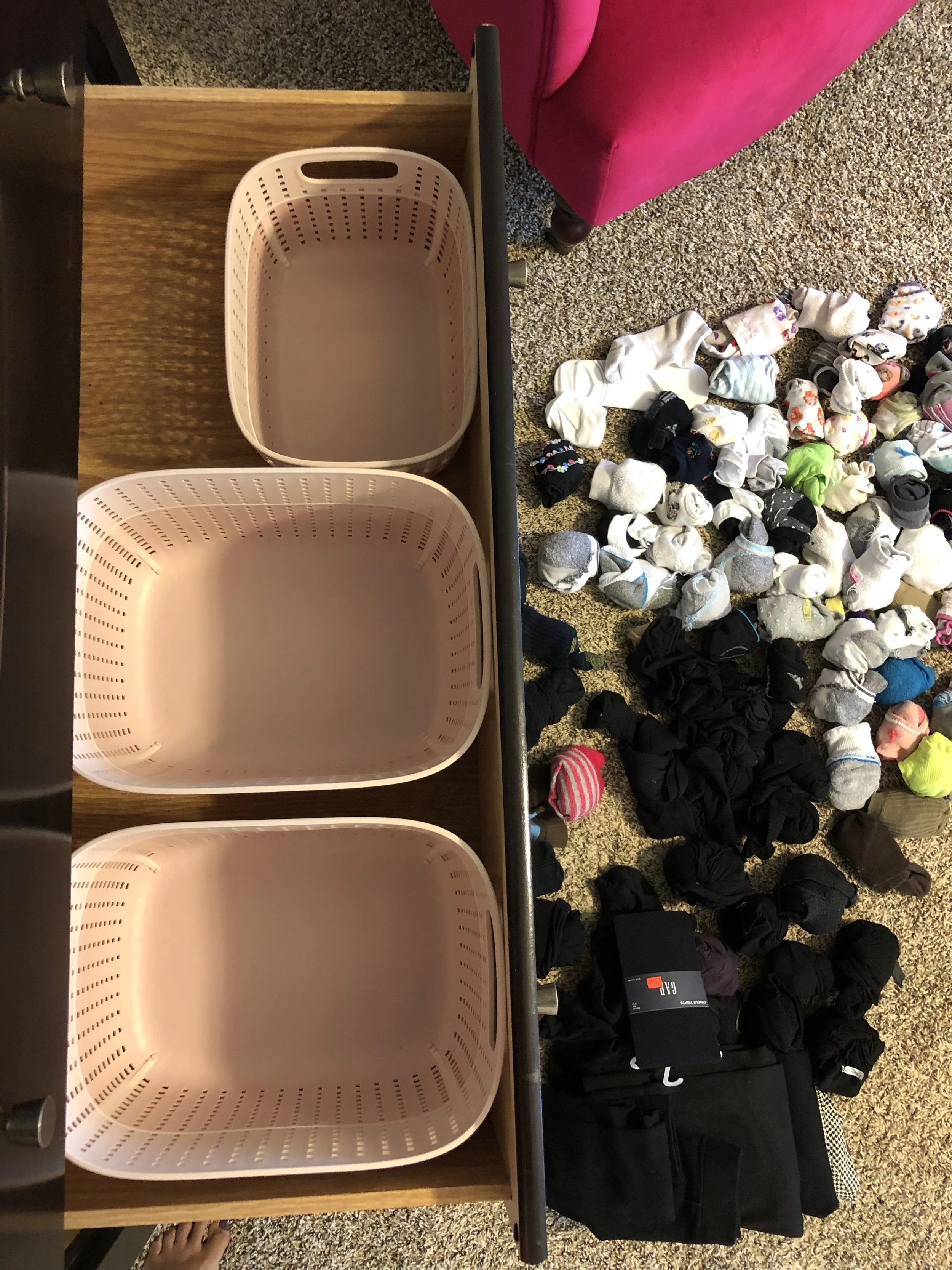 After tediously folding every garment and grouping them by color, season and style, I inserted them back into each designated drawer. I also purchased some plastic baskets from Marshalls that I used to divide the socks and tights to keep that drawer separated and organized. Not only do each of the drawers now close completely without issue, they are filled with only garments I use, can be clearly identified and are organized in a way that’s easy to locate and put on.