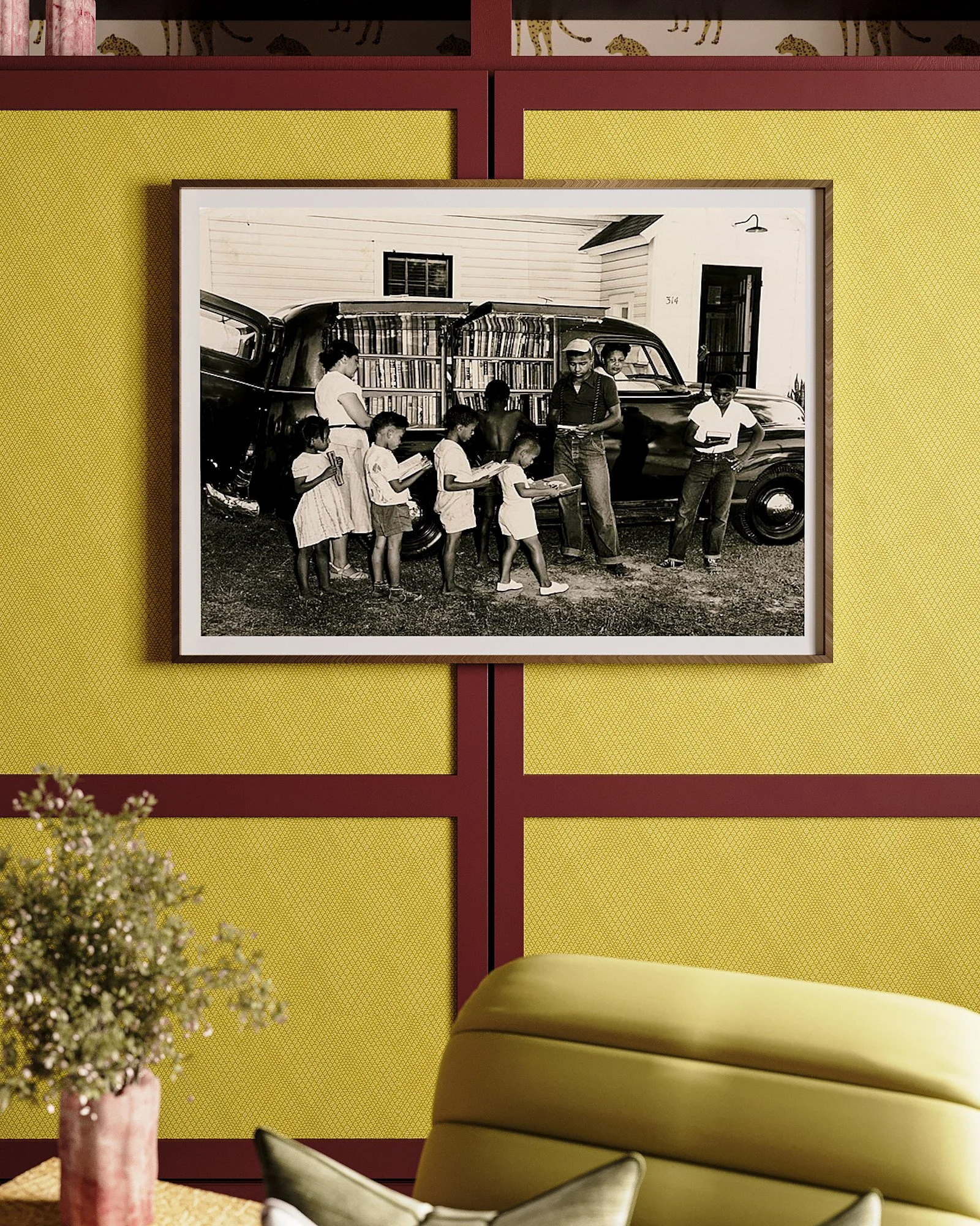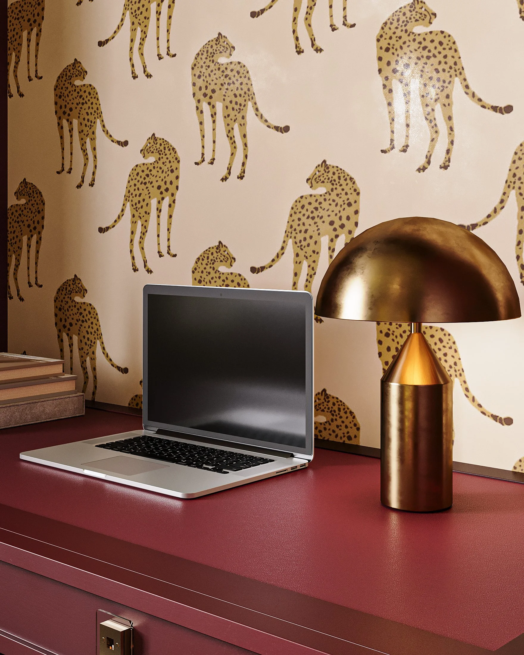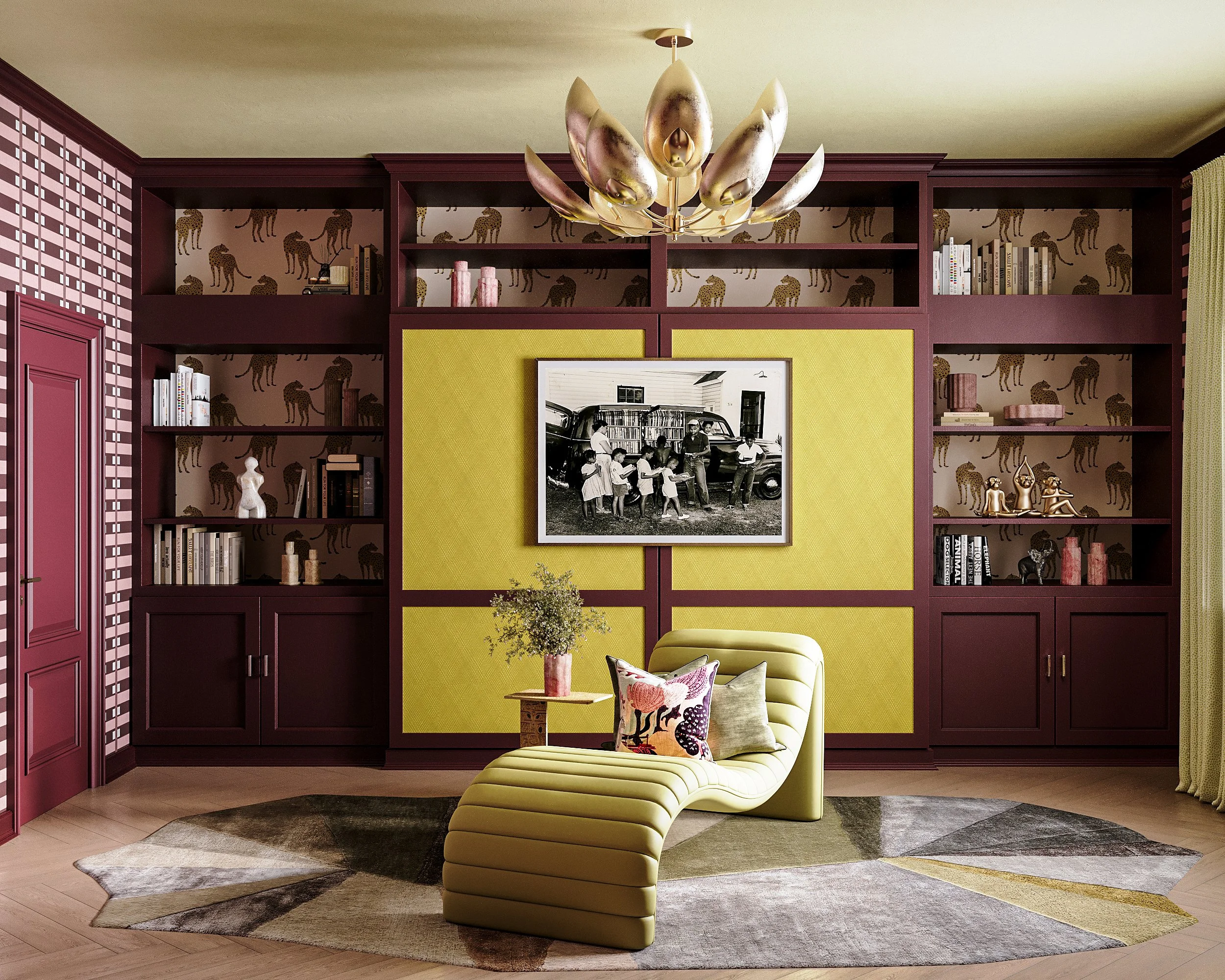 In addition to the textures the Ultraleather fabric introduces, I layered on more pattern and color with Benjamin Moore’s Bewitched and Sesame, and pattern mixing with the rug, drapery, pillows and wallpaper. I used my BLB x Mitchell Black Lowcountry Sweetgrass wallpaper on the surrounding walls, and Mitchell Black’s Prowling Cheetah within the built-in shelving. Lastly, the statement Anastasia chandelier from Arteriors serves as the centerpiece of the room, illuminating the space so you can see every detail in all its sultry and golden glory.
