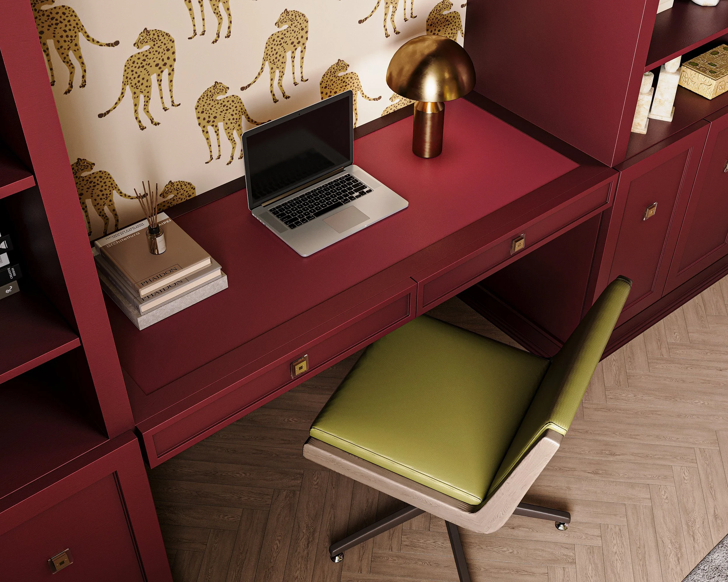 As seen in the mood board, I used several different Ultraleather leather alternative fabrics to enhance every part of my design! I used Wired Lemon Drop on the upholstered headboard and within the millwork wall hiding the murphy bed. Icovered the chaise lounge in Citrus, the desk chair in Olive Leaf, and desk surface in Brisa Beet Root. I love how the yellows, greens, and chartreuse play so well with the moody pinks and burgundys in the color palette.